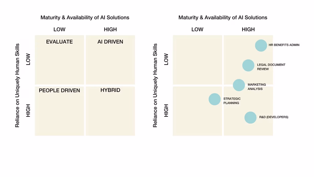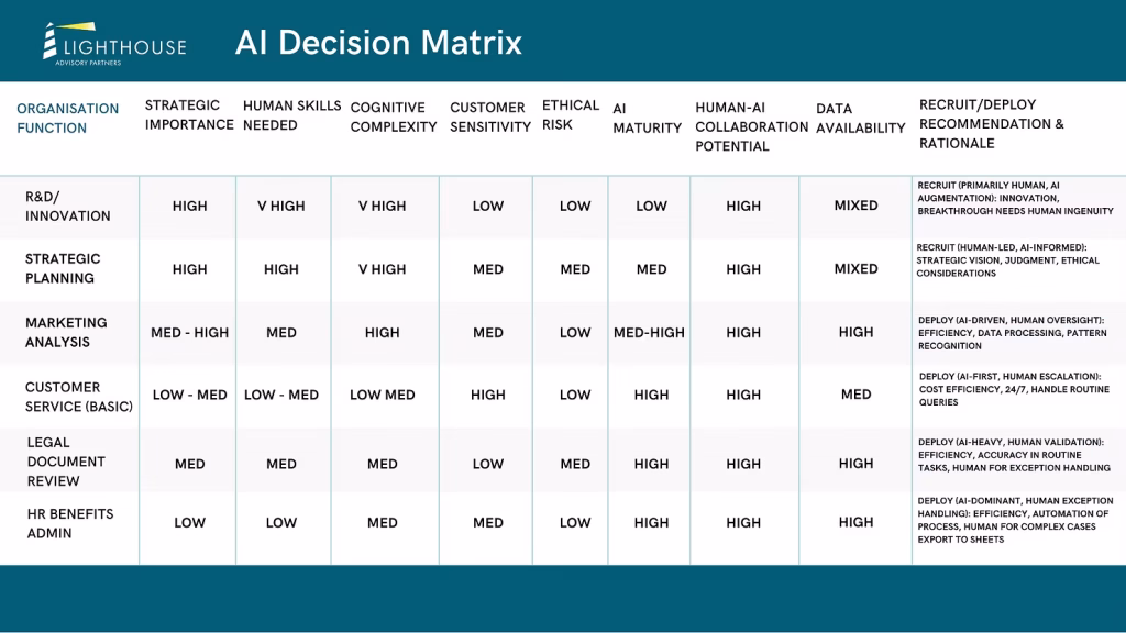 Technology executives should systematically evaluate each organisational function against these criteria, assign scores for comparative analysis, and visualise the assessments in a decision matrix. Functions scoring “Low” on human skills and “High” on AI maturity might be prime candidates for “deploy” decisions, while functions “High” on strategic value and human skills might remain “recruit” dominant.